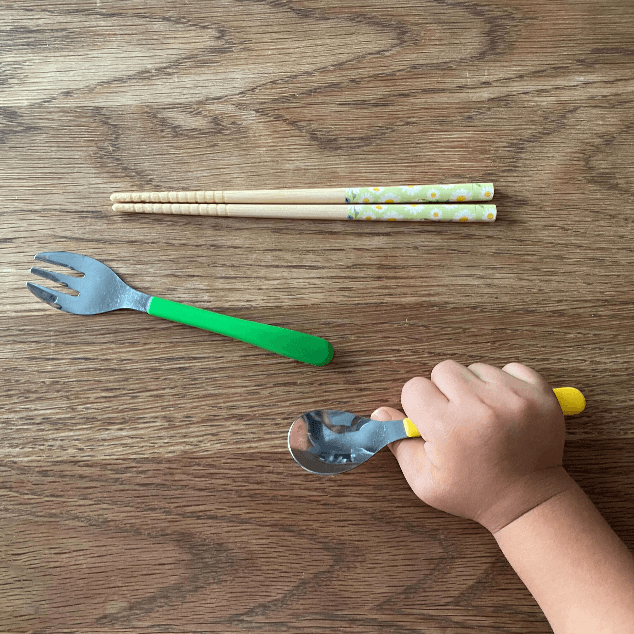 子どもが握りやすく、握ったときに柄が手から少し出る長さが適切。スプーンの先は少し深さがあると食べものを乗せやすく、フォークの溝は2cm程度で先が尖っていないものを選びましょう。箸は長すぎても、短すぎても持ちにくいので3〜4歳で14.5cm、5〜6歳で16cmの長さが目安。