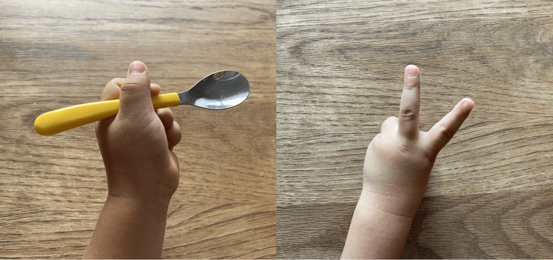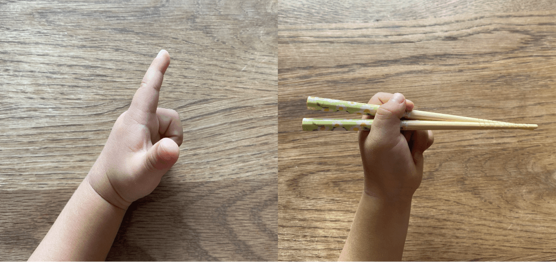 持ち方についての教え方はたくさんあると思いますが一例として…“バキュン”の形をつくり(写真左)、親指と人差し指の間に箸をのせて挟む(写真右)というやり方が伝えやすかったので共有しておきます。子どもも食事中に「バキュンのゆびにして…」とつぶやきながら練習をしているので親しみやすいようです。