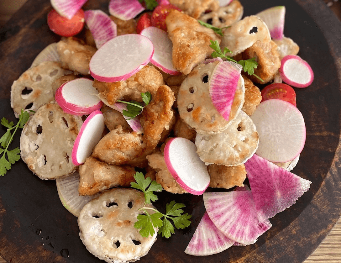 れんこんはしゃくっとした歯ざわりに好みが分かれるので、苦手な場合はすりおろしたり細かく刻んでハンバーグに混ぜて。食感が好きなら鶏のから揚げをつくるときにスライスしたれんこんも漬けておき、片栗粉をまぶして一緒に揚げるのもおすすめ。わが家では2週間に1回は登場する大定番メニューです。