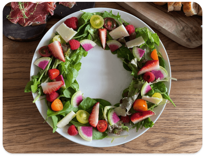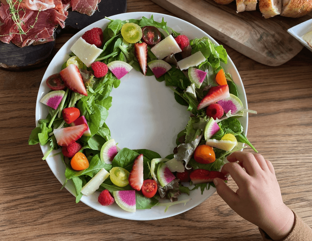 ベビーリーフをリース形に盛り、いちごやトマト、ハム、サーモンなど赤系の食材をちらすだけ。子どもが好きなものと食べられるようになって欲しい食材をのせるのがポイントです。わが子たちはいちごとトマトしか食べませんが「これなあに?」と彩り鮮やかな食材に興味を示していました。
