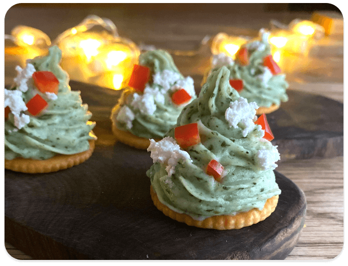 ゆでたじゃがいもをお好みに味付けて(写真はほうれん草で色付けしていますが、そのままでもOK)絞り袋に入れてクラッカーの上にツリー状に絞り出します。赤パプリカやプチトマト、ブロッコリー、チーズなどで飾り付けて完成。