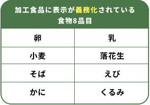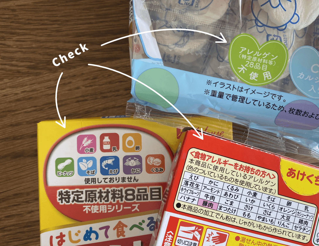 食物アレルギーがある場合、その特定の食材を除去する必要があります。自身や家族がアレルギーでないと見落としがちですが、アレルギーを持つ子と一緒に食事をしたりおやつを食べる機会もあると思うので、アレルギーの有無を確認し、加工食品を選ぶ際には原材料表示を確認するようにしましょう。