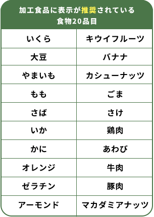 患者数が多く、深刻な症状を引き起こす8品目は表示が義務付けられているので確認を。2023年3月に食品表示基準が改定され「くるみ」が追加されました。表示が推奨されている20品目と併せて紹介します。