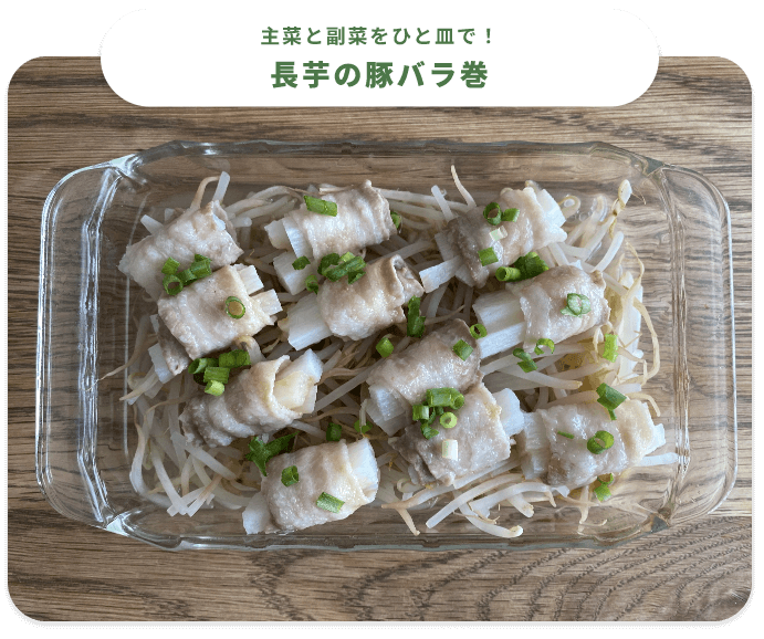 3. 耐熱皿にもやしを広げて、2を並べ電子レンジ(600w)で7分加熱する。※豚バラ肉に火が完全に通るまで加熱。