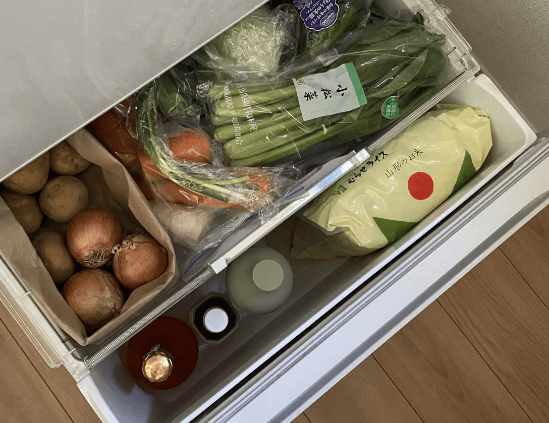 こちらは野菜室。日持ちする玉ねぎ、にんじん、じゃがいも、みそ汁に入れる葉物野菜は必ずストック。常備野菜は定位置に収納することで買い足すタイミングを把握しやすくしています。ひと目で何の野菜があるか分かるよう、重ならないように収納するのもポイント。使いかけの野菜やもやしなど消費期間の短い野菜は野菜室ではなく冷蔵庫の目線の高さに置いています。
