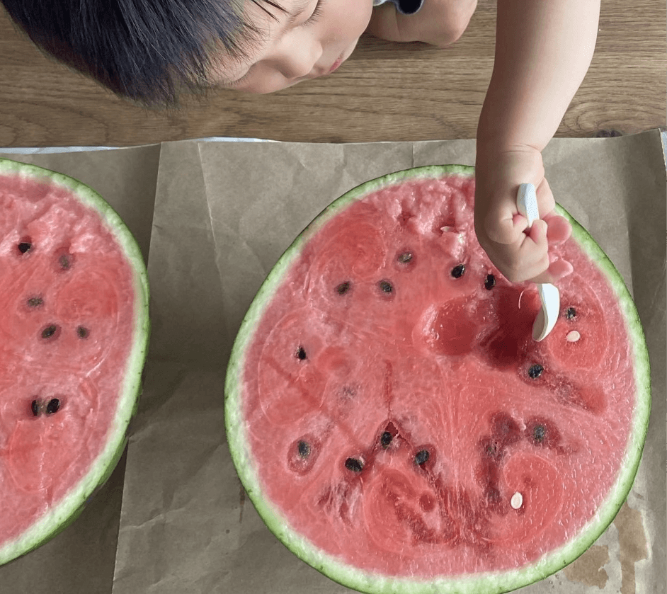 幼児に適した1日あたりの果物の量は1〜3歳未満で100g、3〜6歳未満で150g。甘いお菓子を食べるよりマシと思うかもしれませんが、果糖が含まれ与えすぎてしまうと肥満の原因になるので、おやつの時間に食べる、食事をきちんと食べたあとのデザートに⋯など食べるタイミングをきちんと伝えましょう。わが家の子どもたちも無類のフルーツ好きで、目と手に届く場所に置いてあると勝手にどんどん食べてしまうので、冷蔵庫などに隠し、毎食後に決まった量を出すようにしています。大盛り特別サービスにしても毎回「おかわりある〜?」とねだられますが(笑)