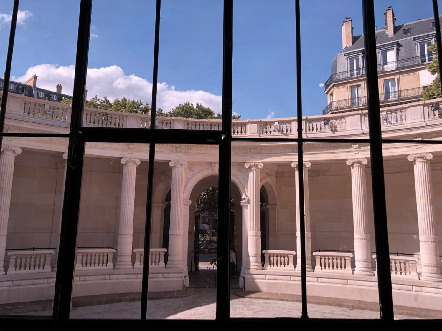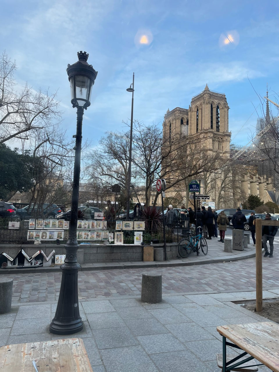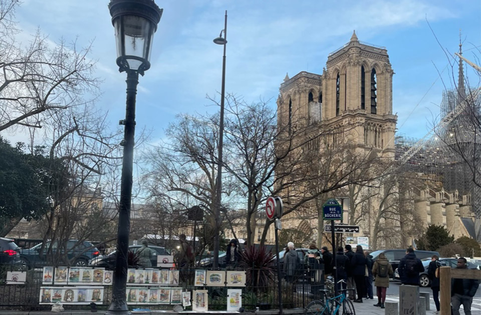 左岸のカフェの窓から。ノートルダムの復興工事もだいぶ進んできました。