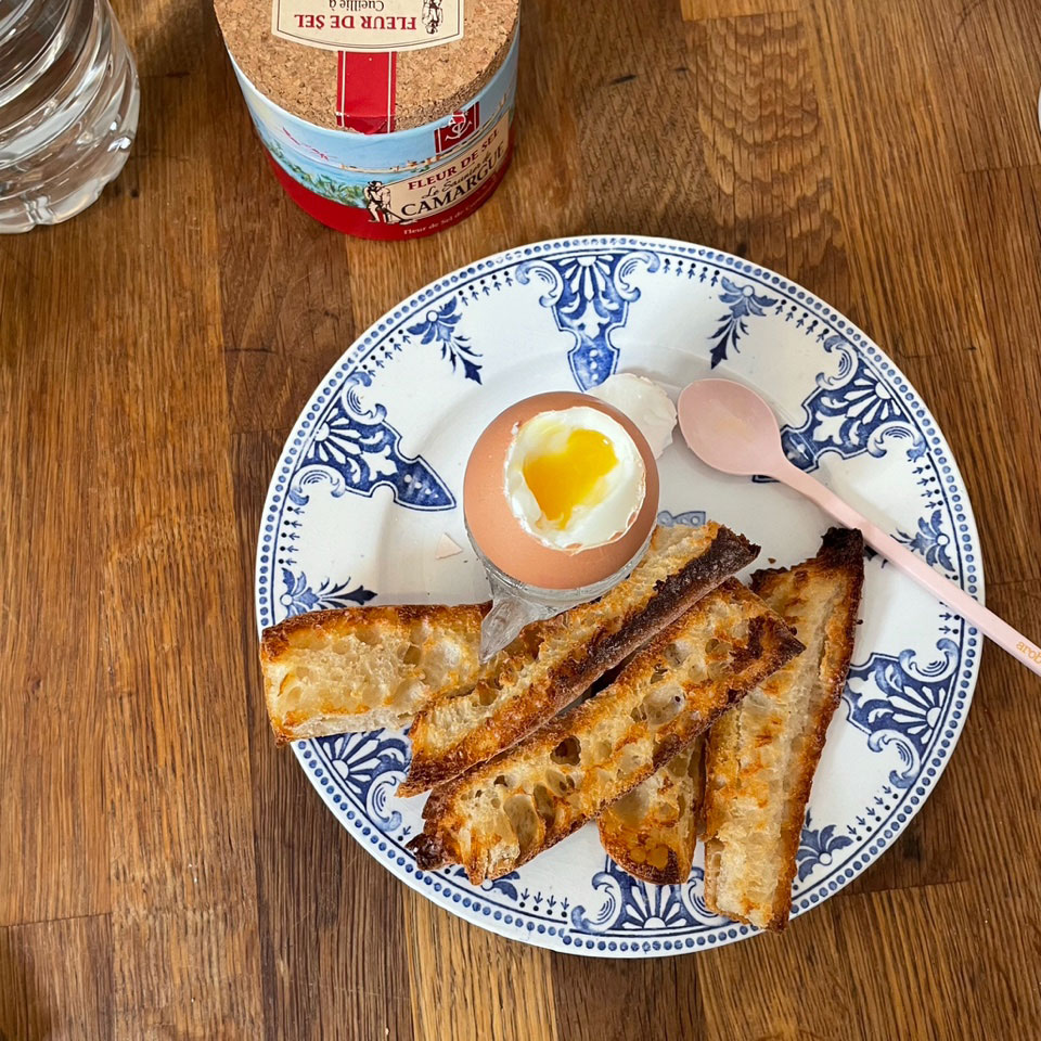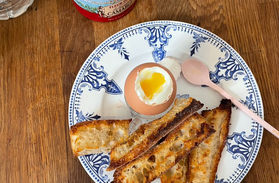 ウフ・ア・ラ・コック 半熟ゆで卵は細く切ったバゲットを浸して食べるのがフランス流