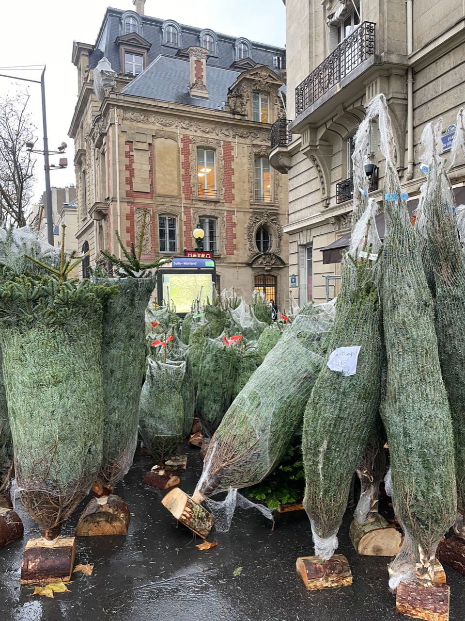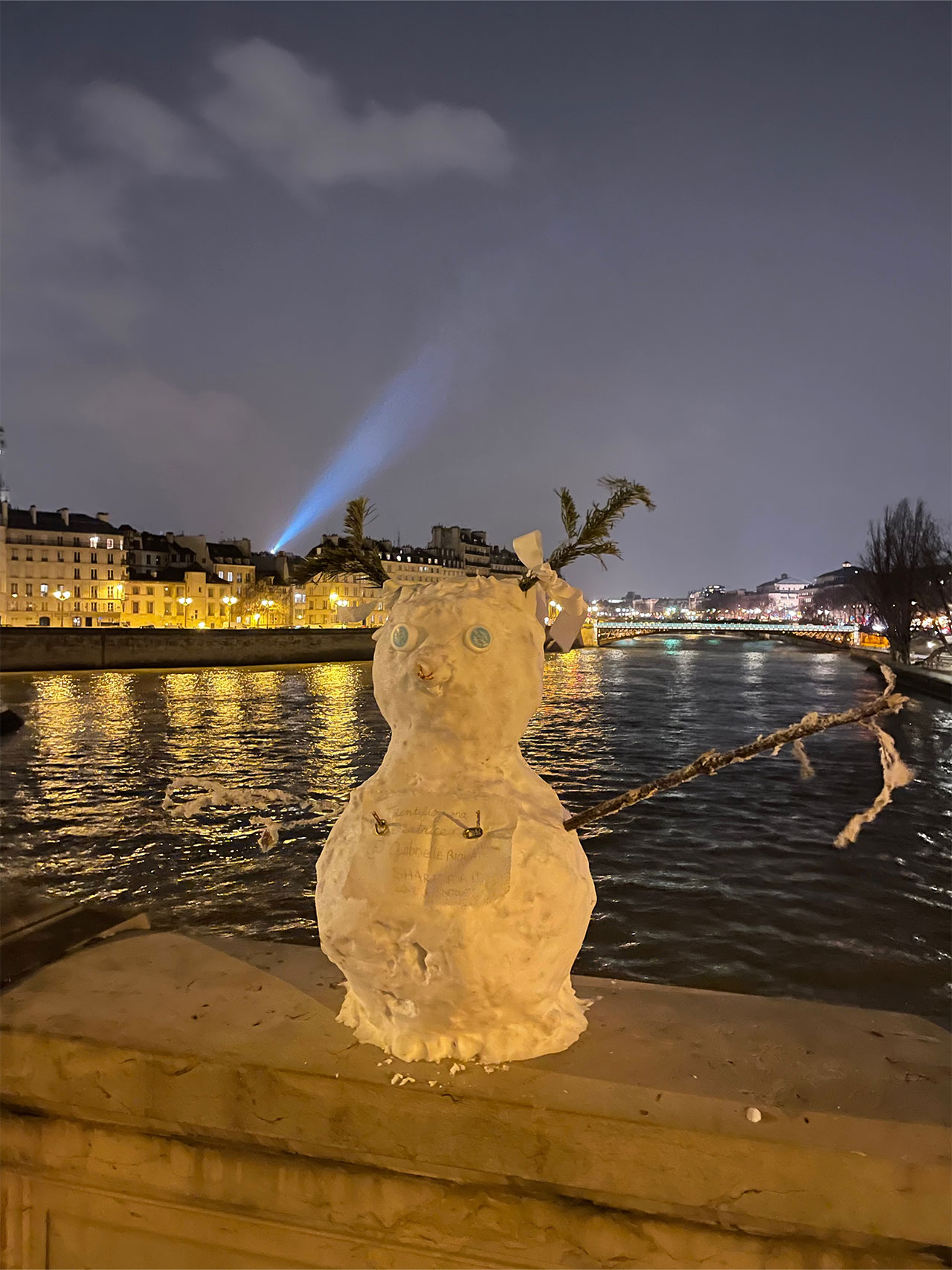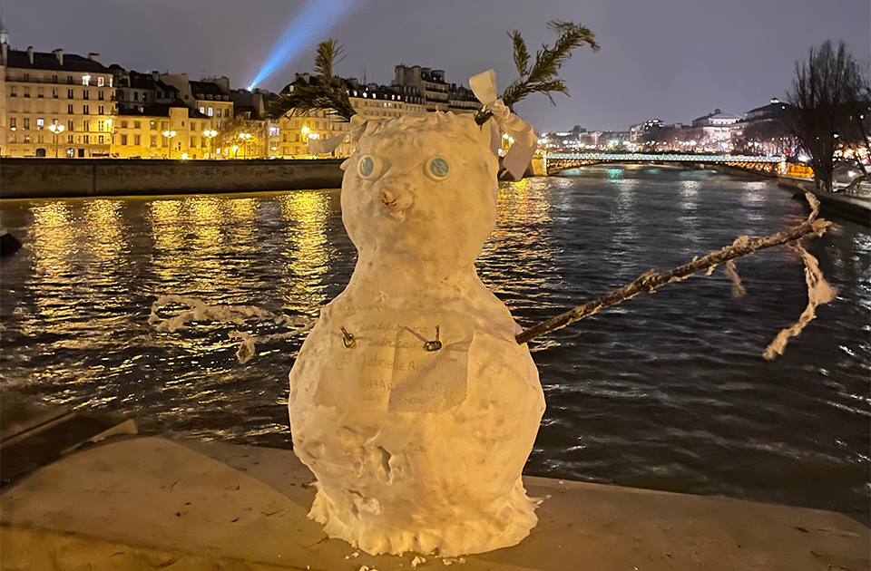 たまたま通りかかったセーヌ橋の上でもみの木の角が生えたかわいい雪だるまに会いました。