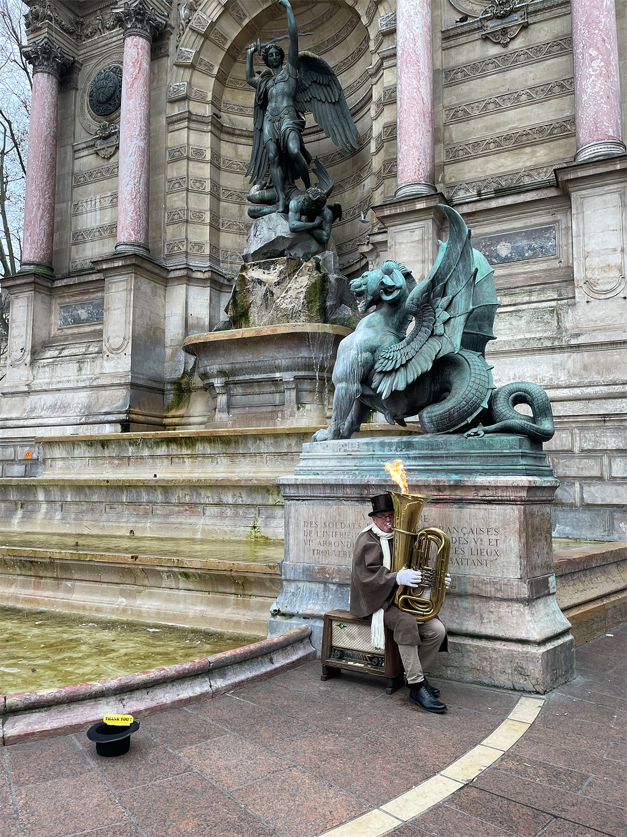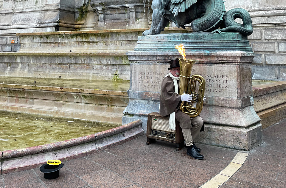 サンミッシェル広場の噴水前。チューバを吹くたびに楽器から炎が上がり、みんなの視線を釘付けにしていました。