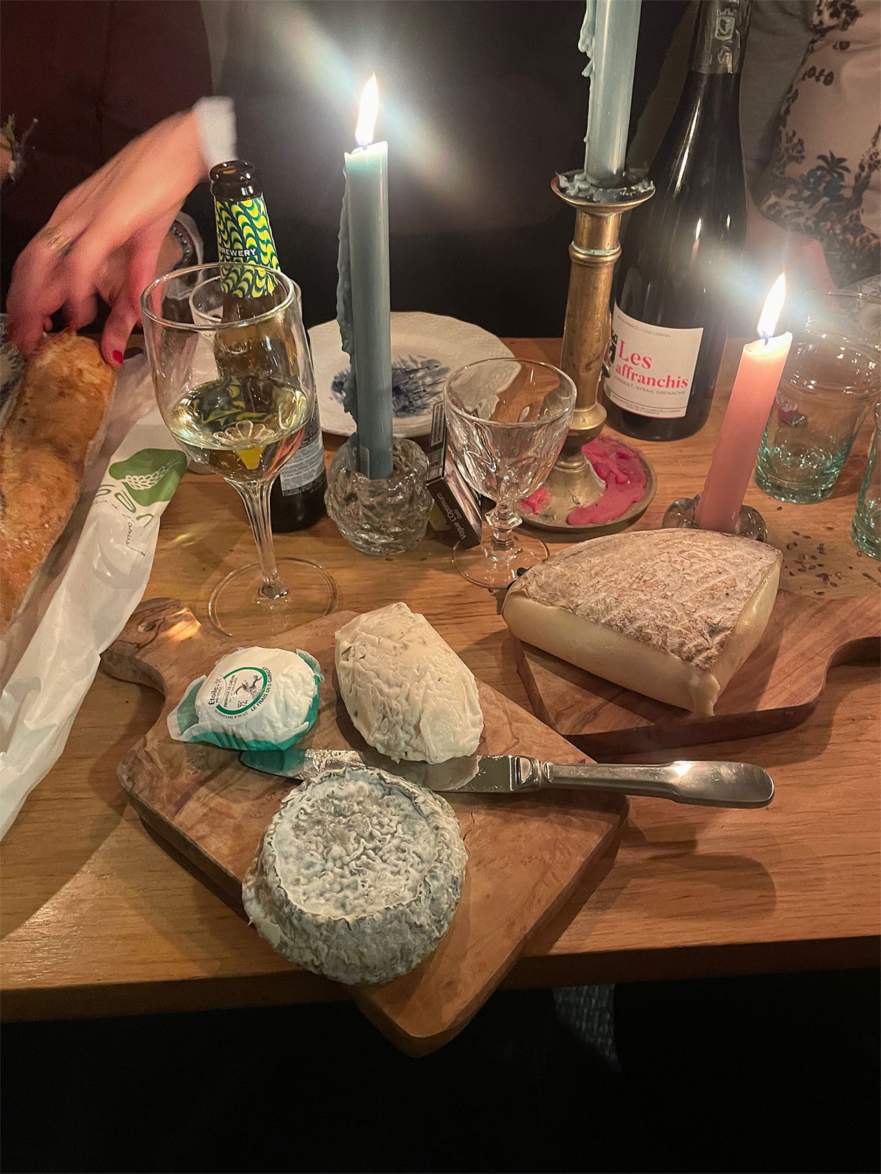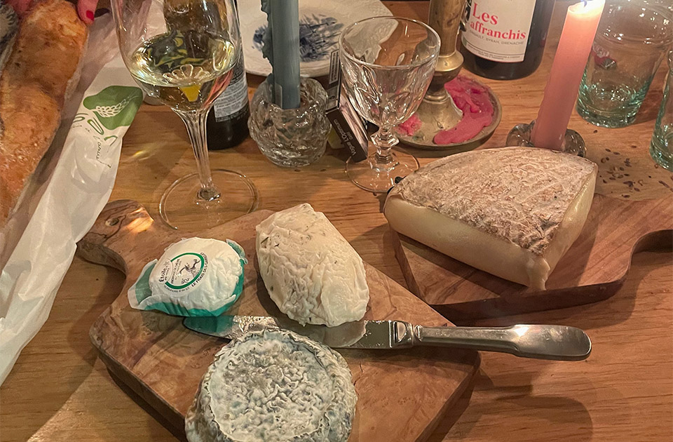 メインとデザートの間にチーズタイムがあるフランスのディナー。自宅での食事会でもホストが充備したり持ち寄ったりで何種類かのチーズが並びます。