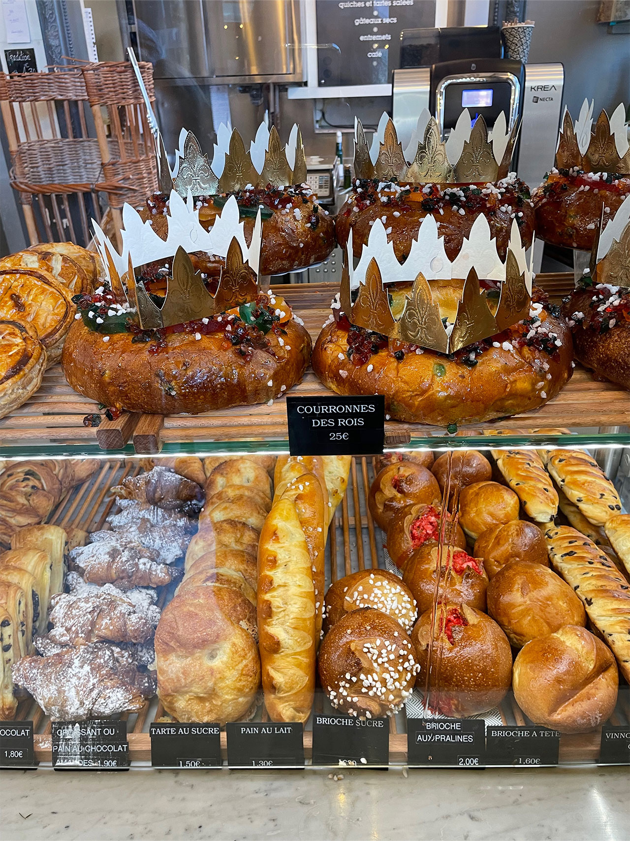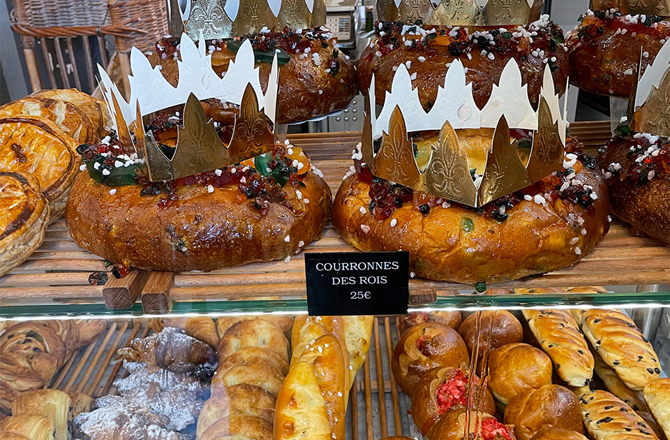 フランスの新年のお菓子といえばガレット・デ・ロワ。アーモンド生地のこのパイと並んでフランスのパン屋さんで見かけるのがCouronne des rois(クロンデロワ)。スペインや南仏、ポルトガルではブリオッシュ生地のこちらのケーキがガレットの代わりに一般的だそうです。