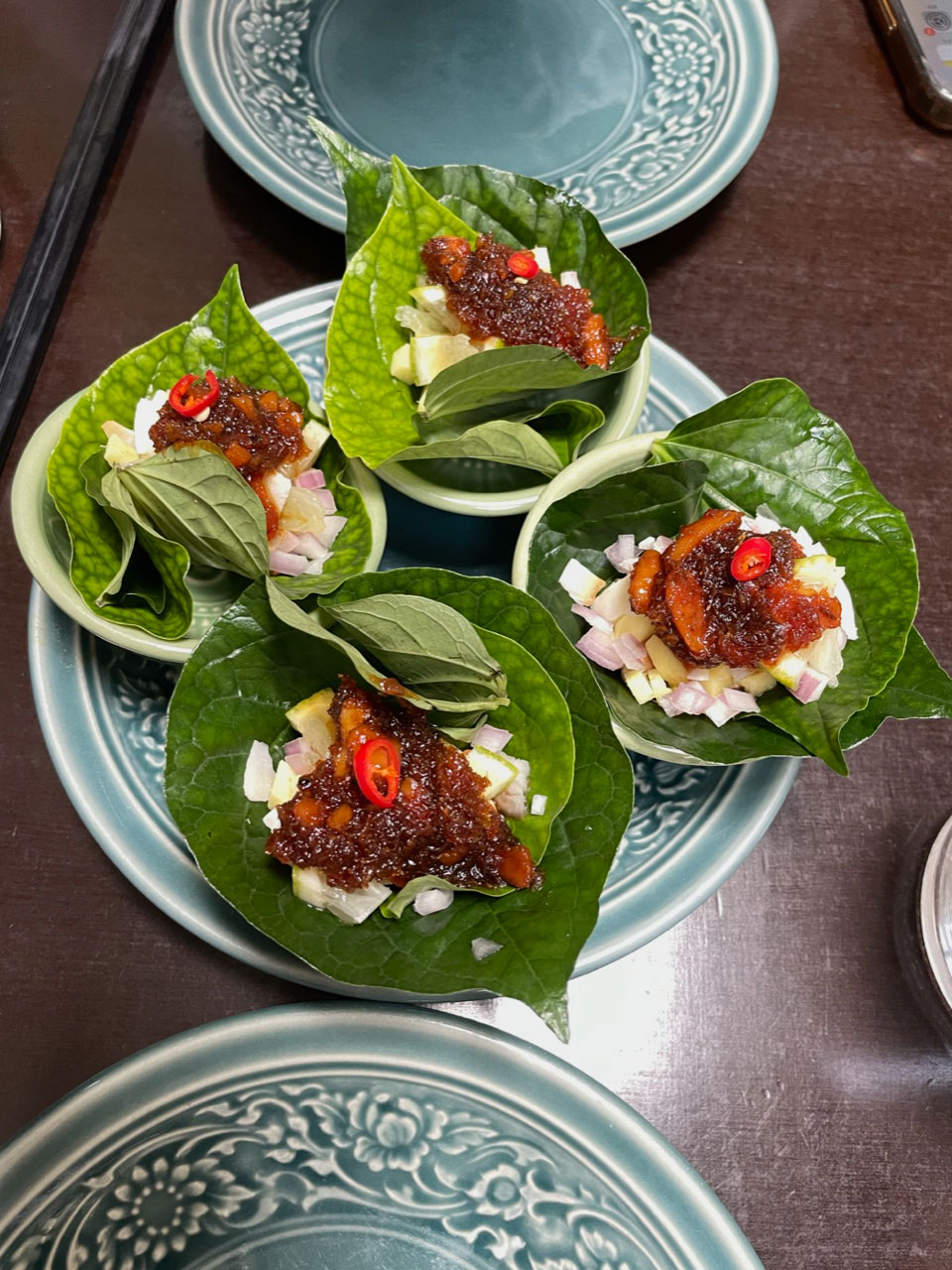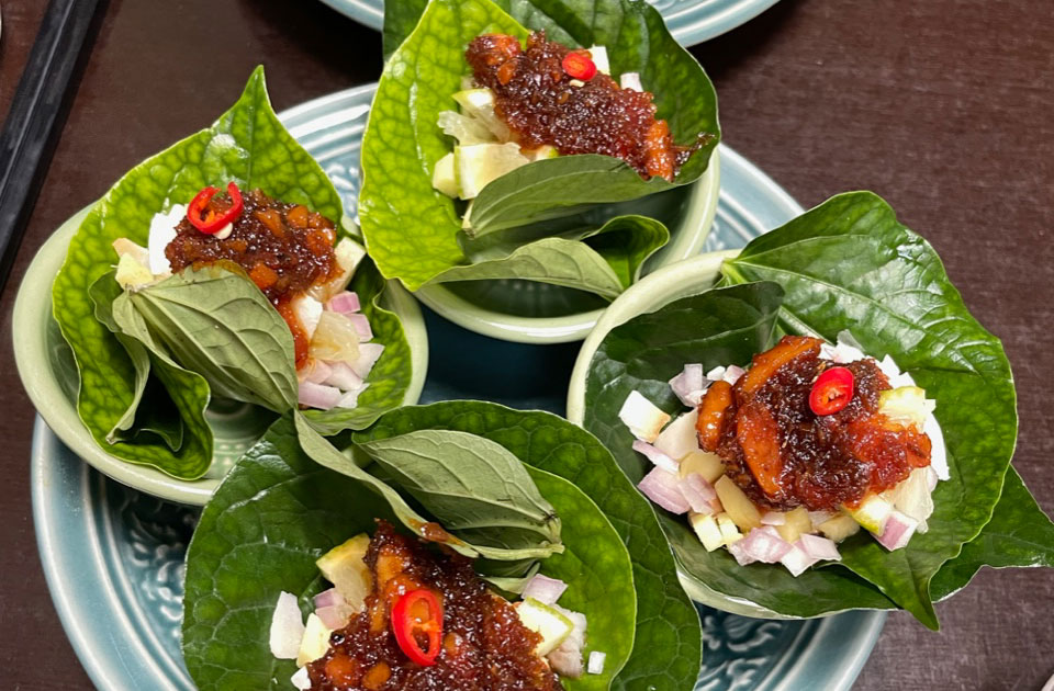 お気に入りのタイ料理で出てくるサラダ。この葉っぱごと一口で食べるのですが 生姜の効いた甘辛たれとライムやエシャロットナッツが混ざって美味しい。