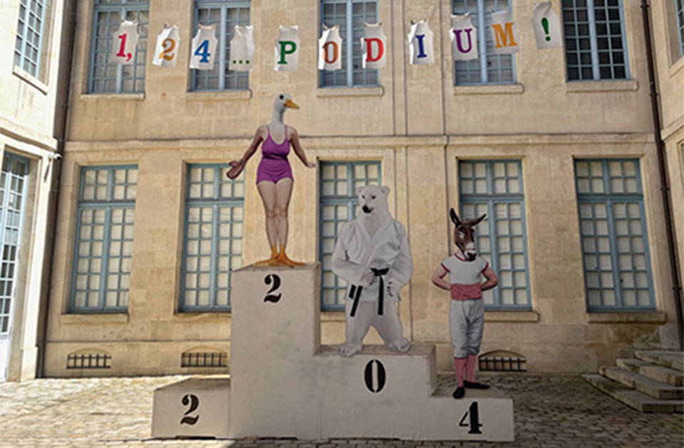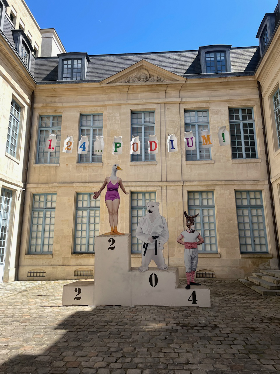 たくさんの剥製が並ぶ狩猟博物館前もユーモラスなオリンピックを意識した展示が!