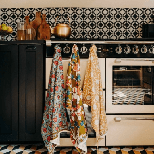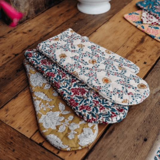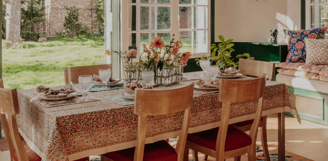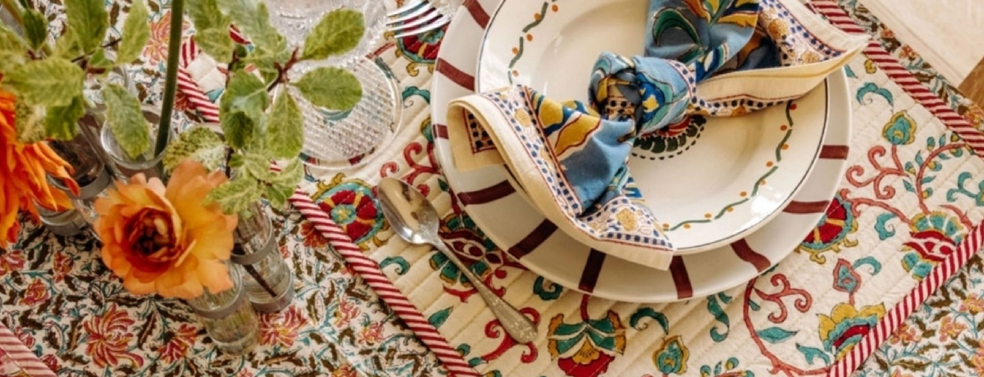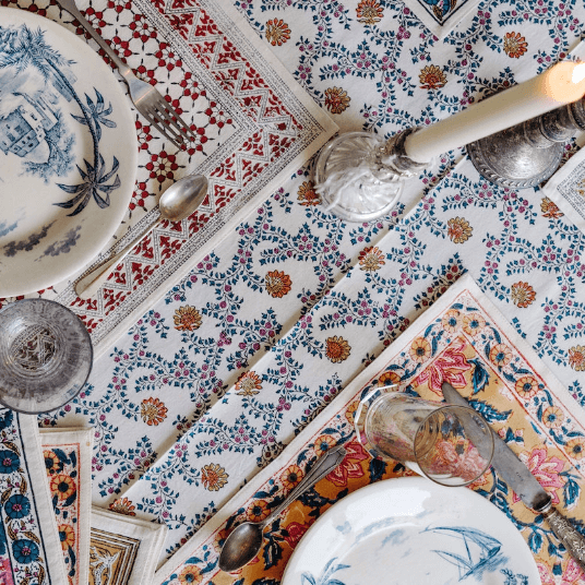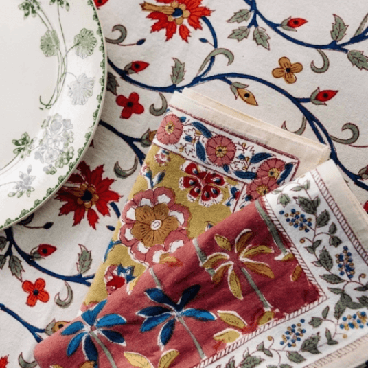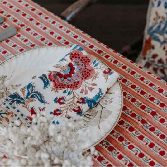 JAMINIのテーブルリネンは100%コットン素材。手作業で施されるブロックプリントが鮮やかに映えるナプキンやキッチンクロスは、日常使いにもギフトにも最適です。