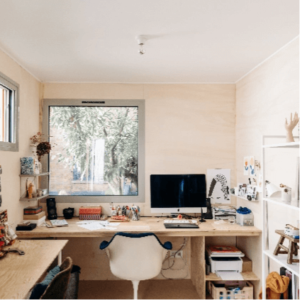 パリ郊外の一軒家の敷地に建てた小さな小屋をアトリエにしているシャーロット。風に揺れる木が見えたり、学校から帰ってきた娘さんが通り過ぎたり。自宅のリラックスした雰囲気と、クリエーションに没頭できる一人の時間が程よく混ざったアトリエでした。