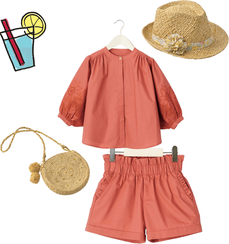 ハリのあるコットン素材のシャツ&ショートパンツは上品な雰囲気で、レストランでの食事などドレスアップしたいシーンに活躍。単品使いもできデニムパンツやTシャツとも好相性。ラフィア素材の小物を組み合わせて着こなしを夏らしくアップデート。
