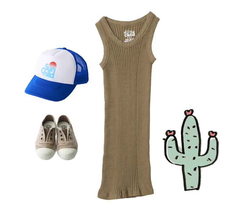 ちょっぴり大人顔のリブニットワンピ。リラックス感のある着心地でビーチやホテルの部屋でくつろぐひとときに◎。キャップとスニーカーを合わせればタウン仕様に。〈NATURAL WORLD〉のスリッポンは重ねると薄くなり旅先のもう一足に必携です!