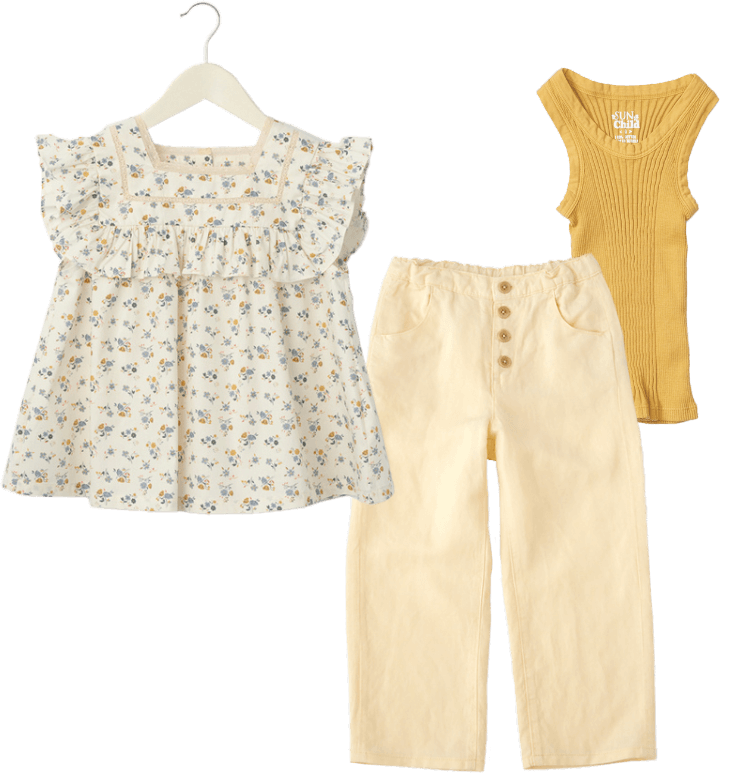 フルレングスのパンツは日除け虫除けだけではなく、移動中の車内機内の冷房対策にもひと役。トップスは鮮やかカラーor甘めデザインを合わせて、女の子らしく着こなして。
