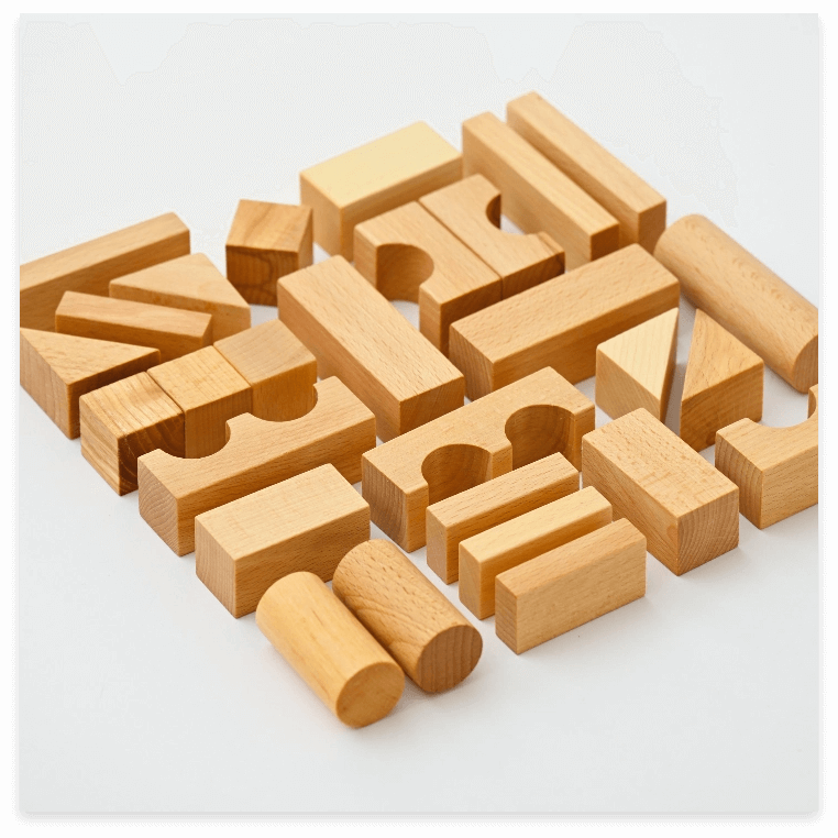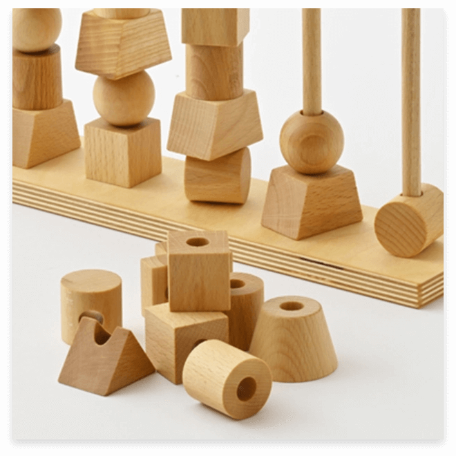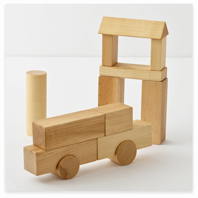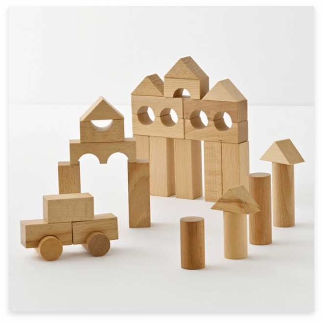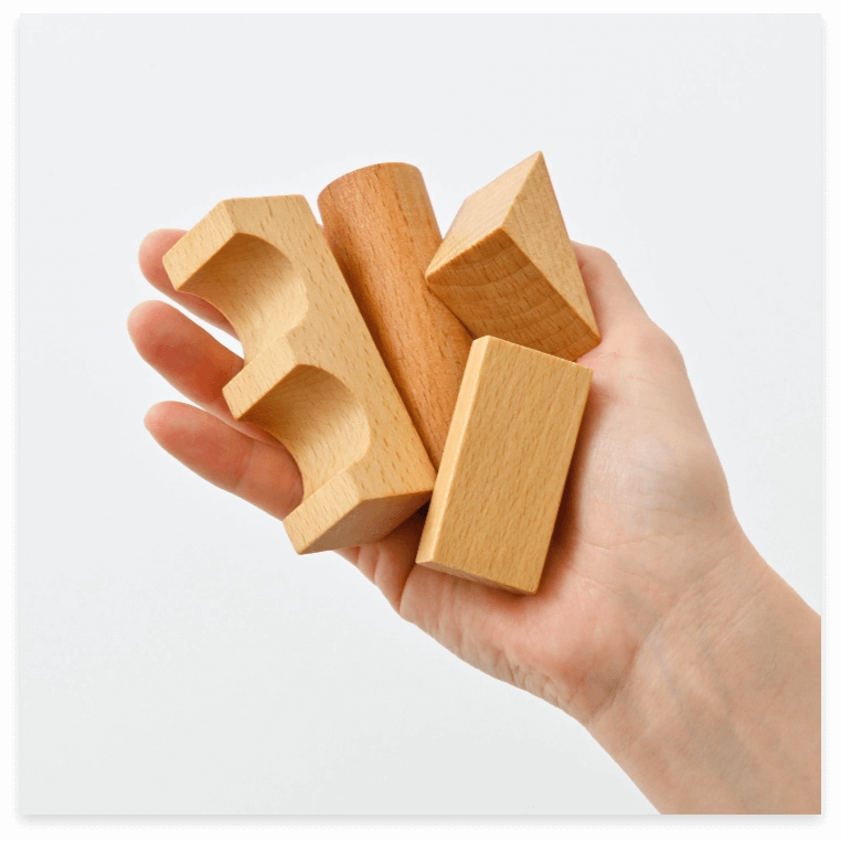 木の香り、ぬくもり、さまざまな形状のピースが子どもの感性や創造力をはぐくみます。ねんね期には赤ちゃんの小さな手に握らせて木の感触を楽しませたり、おすわり期には積み木くずしなど、月齢に合わせた遊び方ができるので出産のプレゼントとして早すぎることもありません。1歳を過ぎたらお子さま自身が積み上げてくずしたり、2歳を過ぎたらお城や車を作ったり…自由な発想で遊べます。